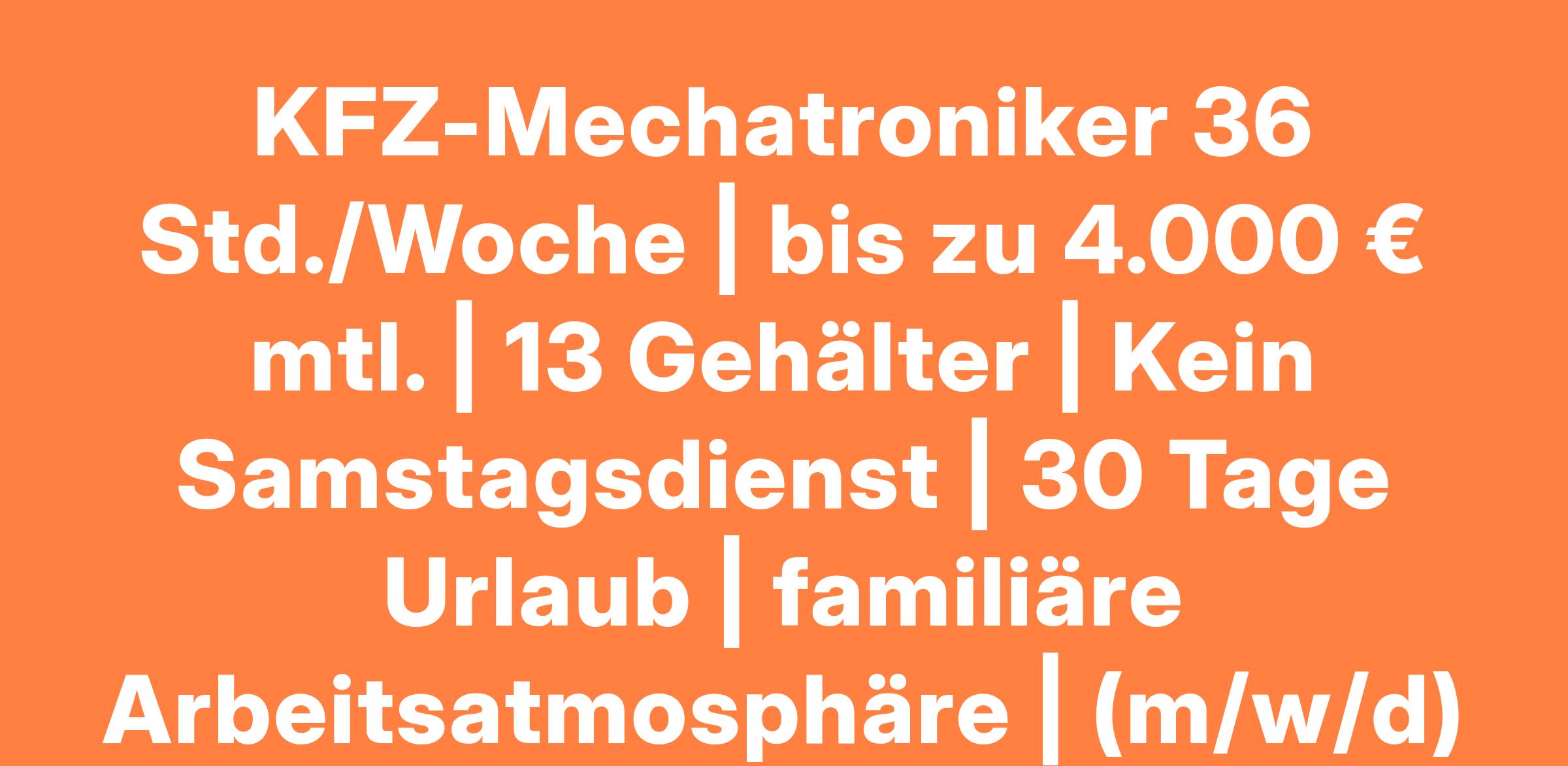 KFZ-Mechatroniker 36 Std./Woche | bis zu 4.000 € mtl. | 13 Gehälter | Kein Samstagsdienst | 30 Tage Urlaub | familiäre Arbeitsatmosphäre | (m/w/d)